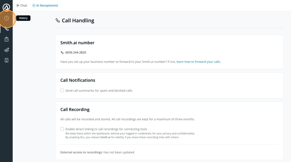 Once you have completed a test call, return to the main page of your dashboard and select "History"