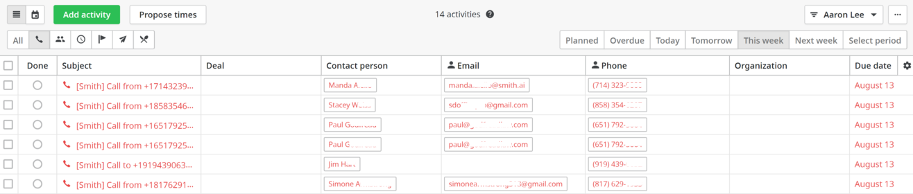 That's it! We'll let you know as soon as the integration setup is complete, typically within 1 business day. Once your accounts are linked, you'll see Pipedrive contacts and activities added and updated by AI Receptionist after each call.
