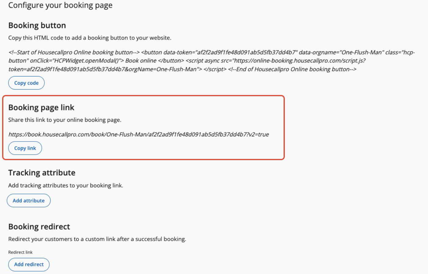 - Input the booking page link for your Housecall Pro online booking form (instructions here)