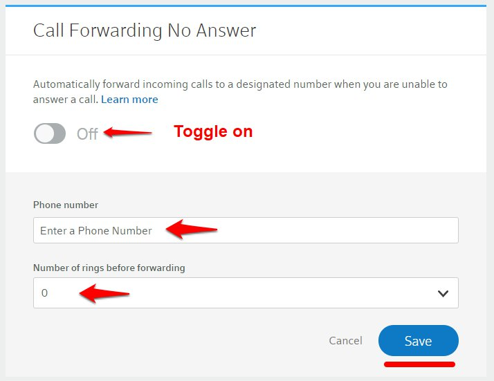To forward calls if there is no answer on your line, use the Call Forwarding No Answer section. Insert your Smith number and select how many rings you'd like a call to have before forwarding. Ensure your toggle is set to On and click Save.
