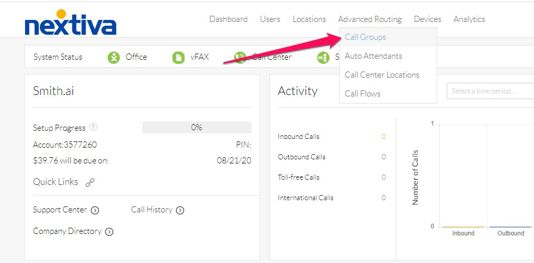 From the Nextiva Voice Admin Dashboard, go to Advanced Routing and click Call Groups.
