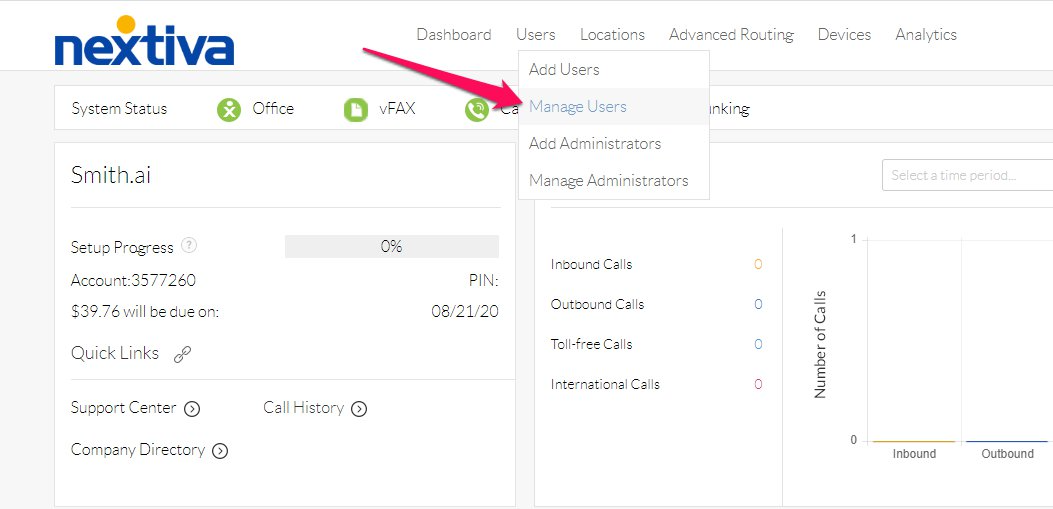 From the Nextiva Voice Admin Dashboard, go to Users and select Manage Users.
