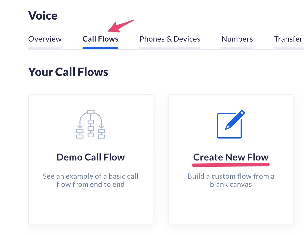 In the left menu click on Voice, and then go to Call Flows to create a new call flow.