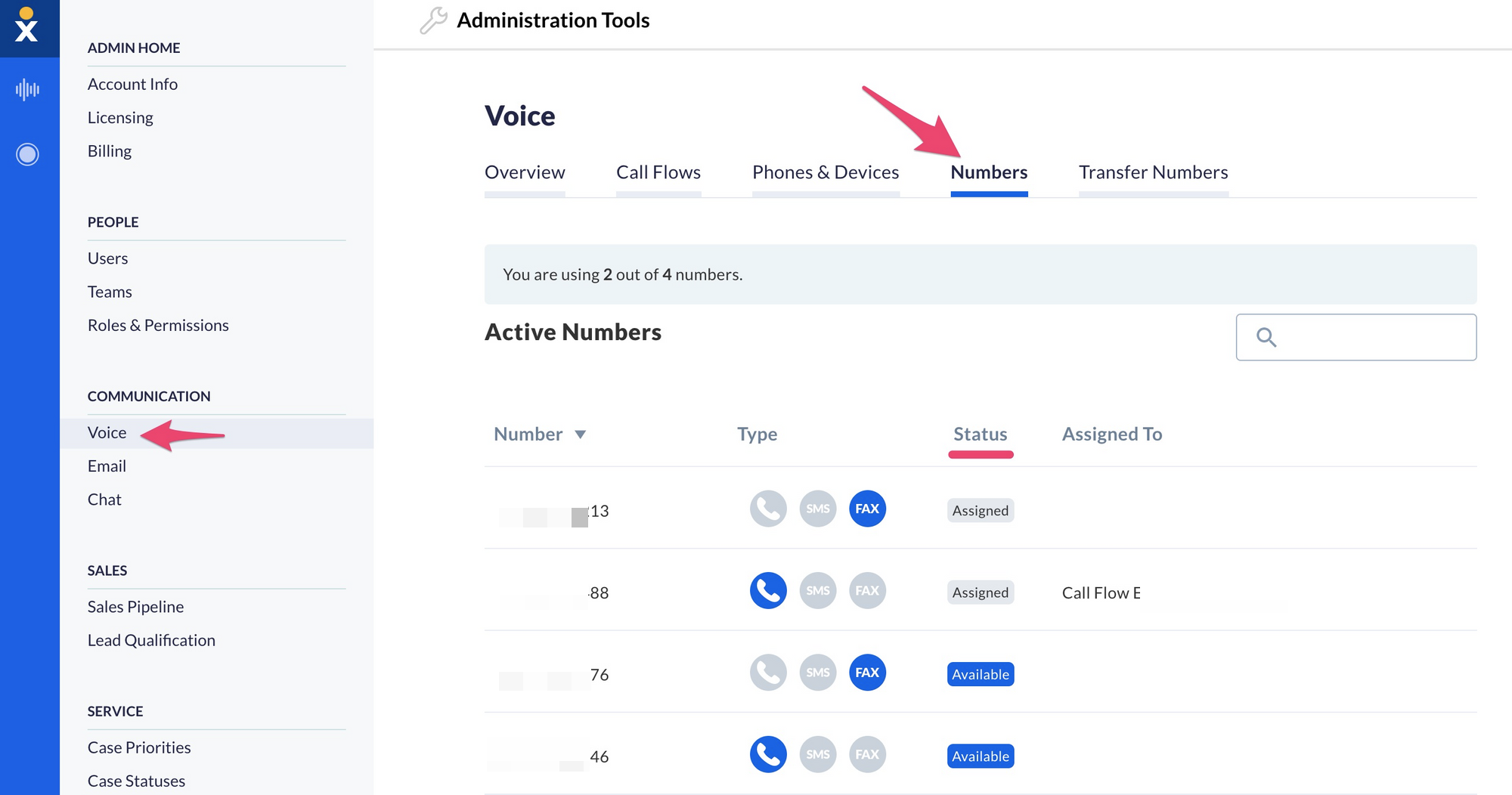 You can review and check your Nextiva numbers under the Numbers menu. You'll be able to see if they are Assigned, and what type of line it is.