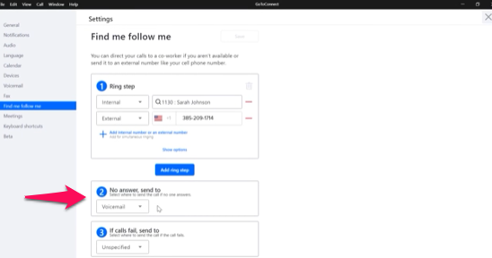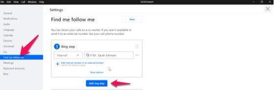 From GoToConnect desktop or web, click your profile picture in the left sidebar, choose Settings and then click Find me follow me.
