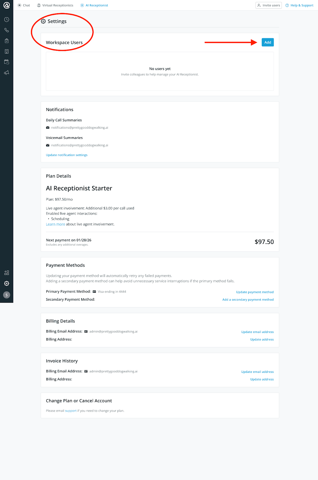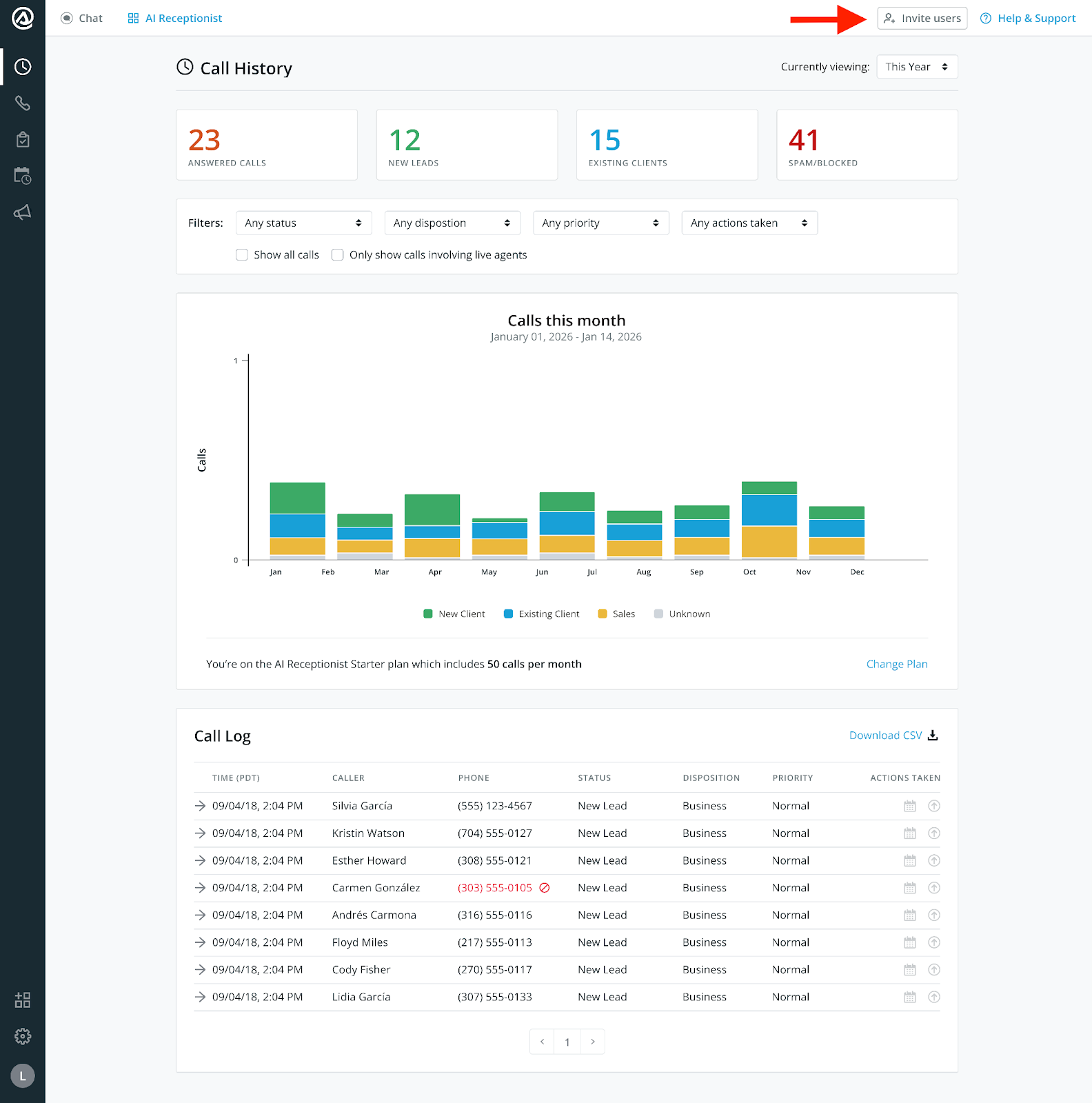 Give your choice of users access to your AI Receptionist account with their own credentials at no additional cost. It’s easy to invite new users and manage their access from your account dashboard.